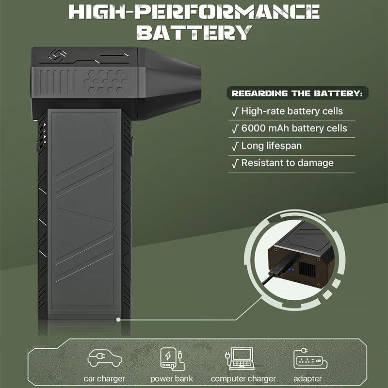 • Fast Charging and Long Battery Life: The air duster supports fast charging up to 10W, takes 2.5 hours to fully charge and provides up to 100 minutes of use on a full charge. The battery includes temperature, current, and short-circuit protection, ensuring consistent speed and performance even with extended use