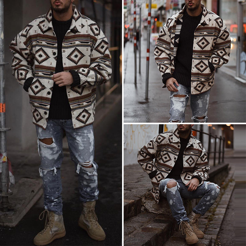 Printed Geometric Lapel Button-Up Jacket