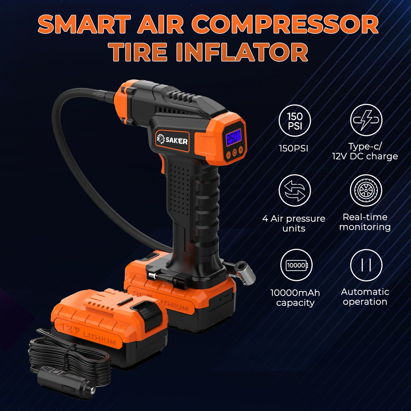 {"id":8486942048471,"title":"Car Tire Air Pump","handle":"car-tire-air-pump-1","description":"\u003cp\u003e\u003cspan style=\"color: rgb(255, 128, 0);\"\u003e\u003cstrong\u003e\u003cspan class=\"a-list-item\"\u003eFEATURES\u003c\/span\u003e\u003c\/strong\u003e\u003c\/span\u003e\u003c\/p\u003e\n\u003cul\u003e\n\u003cli\u003e\n\u003cp\u003e\u003cspan\u003e\u003cspan class=\"a-list-item\"\u003e\u003cstrong\u003e20V Powerful Battery, Max 150PSI Air Pressure\u003c\/strong\u003e\u003cbr\u003eThis t ire Inflator has 150PSI max air pressure output and a 20V lithium battery comes with 3 valve adapters, can fast inflate tires of all-size SUVs, cars, motorcycles, bikes, and so on in minutes. Saker air compressor for car is a reliable and powerful savior for drivers.\u003cimg alt=\"\" src=\"https:\/\/cdn.shopify.com\/s\/files\/1\/0356\/3048\/1544\/files\/6_2f46c128-2473-4ff3-9ab2-73652c4e523b.jpg?v=1715331611\" width=\"480\" height=\"480\" style=\"display: block; margin-left: auto; margin-right: auto;\"\u003e\u003c\/span\u003e\u003c\/span\u003e\u003c\/p\u003e\n\u003c\/li\u003e\n\u003cli\u003e\n\u003cp\u003e\u003cspan\u003e\u003cspan class=\"a-list-item\"\u003e\u003cstrong\u003e10000mAh High Capacity Battery, 18000RPM Copper Motor\u003c\/strong\u003e\u003cbr\u003eThe air pump for car tires built-in 20V 5*2000mAh high capacity battery with 18000RPM copper motor, providing you with powerful power and range, speeding up your inflating time can fully inflate 4 tires (185\/70 R14) in less than 25 minutes on a single charge.\u003c\/span\u003e\u003c\/span\u003e\u003c\/p\u003e\n\u003c\/li\u003e\n\u003cli\u003e\n\u003cp\u003e\u003cspan\u003e\u003cspan class=\"a-list-item\"\u003e\u003cstrong\u003eReal-time Pressure Monitoring\u003c\/strong\u003e\u003cbr\u003eThis electric air pump has a built-in LCD screen to monitor the pressure of the tire in real-time. It will stop automatically when it reaches the preset air pressure value. Saker tire air compressor is very easy to operate, and this portable air pump for car tires can protect your vehicle and your own safety.\u003cimg alt=\"\" src=\"https:\/\/cdn.shopify.com\/s\/files\/1\/0356\/3048\/1544\/files\/5_0e9aad9c-e63f-42b6-ada5-9cd17dacd1a3.jpg?v=1715331611\" width=\"481\" height=\"481\" style=\"display: block; margin-left: auto; margin-right: auto;\"\u003e\u003c\/span\u003e\u003c\/span\u003e\u003c\/p\u003e\n\u003c\/li\u003e\n\u003cli\u003e\n\u003cp\u003e\u003cspan\u003e\u003cspan class=\"a-list-item\"\u003e\u003cstrong\u003eDual Power Supply Modes\u003c\/strong\u003e\u003cbr\u003eThe portable air compressor for car has two power supplies: a 20V rechargeable battery and a 12V DC car charger, so it can keep on inflating even when the battery runs out. 3m power cord with storage space at the base for easy storage.\u003c\/span\u003e\u003c\/span\u003e\u003c\/p\u003e\n\u003c\/li\u003e\n\u003cli\u003e\n\u003cp\u003e\u003cspan\u003e\u003cspan class=\"a-list-item\"\u003e\u003cstrong\u003eMore User-Friendly Design\u003c\/strong\u003e\u003cbr\u003eThis cordless air pump for car features a unique ergonomic handle design with a 40cm long air hose that makes it easy to stand on the ground to inflate car tires, and the always-on LED light makes this car compressor tire inflator convenient to inflate in the dark or during nighttime emergencies.\u003cimg alt=\"\" src=\"https:\/\/cdn.shopify.com\/s\/files\/1\/0356\/3048\/1544\/files\/2_081f7856-9497-4738-934e-b778334075d4.jpg?v=1715331612\" width=\"481\" height=\"481\" style=\"display: block; margin-left: auto; margin-right: auto;\"\u003e\u003c\/span\u003e\u003c\/span\u003e\u003c\/p\u003e\n\u003c\/li\u003e\n\u003c\/ul\u003e\n\u003cp\u003e\u003cspan style=\"color: rgb(255, 128, 0);\"\u003e\u003cstrong\u003e\u003cspan class=\"a-list-item\"\u003eHOW TO USE\u003c\/span\u003e\u003c\/strong\u003e\u003c\/span\u003e\u003c\/p\u003e\n\u003cp\u003e\u003cspan style=\"color: rgb(255, 128, 0);\"\u003e\u003cstrong\u003e\u003cspan class=\"a-list-item\"\u003e\u003cimg alt=\"\" src=\"https:\/\/cdn.shopify.com\/s\/files\/1\/0356\/3048\/1544\/files\/4_1c43dfec-bcf0-4e72-bb11-57ee39b865d7.jpg?v=1715331611\" width=\"483\" height=\"483\" style=\"display: block; margin-left: auto; margin-right: auto;\"\u003e\u003c\/span\u003e\u003c\/strong\u003e\u003c\/span\u003e\u003c\/p\u003e\n\u003cp\u003e\u003cspan style=\"color: rgb(255, 128, 0);\"\u003e\u003cstrong\u003e\u003cspan class=\"a-list-item\"\u003eSPECIFICATIONS\u003c\/span\u003e\u003c\/strong\u003e\u003c\/span\u003e\u003cspan style=\"color: rgb(255, 128, 0);\"\u003e\u003cstrong\u003e\u003cspan class=\"a-list-item\"\u003e\u003c\/span\u003e\u003c\/strong\u003e\u003c\/span\u003e\u003c\/p\u003e\n\u003cul\u003e\n\u003cli\u003e\n\u003cp\u003e\u003cb\u003eColor:\u003c\/b\u003e\u003cspan\u003e \u003c\/span\u003eOrange\u003c\/p\u003e\n\u003c\/li\u003e\n\u003cli\u003e\n\u003cp\u003e\u003cstrong\u003eCapacity: \u003c\/strong\u003e20V\/5*2000mAh\u003c\/p\u003e\n\u003c\/li\u003e\n\u003cli\u003e\n\u003cp\u003e\u003cstrong\u003eUSB Input: \u003c\/strong\u003e5V12A\u003c\/p\u003e\n\u003c\/li\u003e\n\u003cli\u003e\n\u003cp\u003e\u003cstrong\u003ePower Supply: \u003c\/strong\u003e20V Li-ion Battery \/ 12V Car Charger\u003c\/p\u003e\n\u003c\/li\u003e\n\u003cli\u003e\n\u003cp\u003e\u003cstrong\u003eUnit Display: \u003c\/strong\u003ePSI,BAR,KPA, Kg\/cm2\u003c\/p\u003e\n\u003c\/li\u003e\n\u003cli\u003e\n\u003cp\u003e\u003cstrong\u003eInflation Efficiency: \u003c\/strong\u003e0 -2.5Bar in 6 Mins (Tire: 185 \/ 70R14)\u003c\/p\u003e\n\u003c\/li\u003e\n\u003cli\u003e\n\u003cp\u003e\u003cstrong\u003eThe Length of Hose:\u003c\/strong\u003e 150+10mm\/5.91*0.39in\u003c\/p\u003e\n\u003c\/li\u003e\n\u003cli\u003e\n\u003cp\u003e\u003cstrong\u003eDimension: \u003c\/strong\u003e154*260*77mm\/6.06*10.24*3.03in\u003c\/p\u003e\n\u003c\/li\u003e\n\u003cli\u003e\n\u003cp\u003e\u003cstrong\u003eBare Machine Weight: \u003c\/strong\u003e560g\/1.23lbs\u003c\/p\u003e\n\u003c\/li\u003e\n\u003c\/ul\u003e\n\u003cp\u003e\u003cspan style=\"color: rgb(