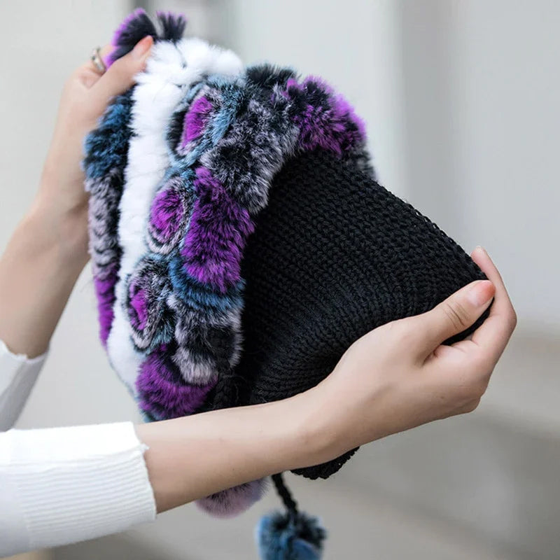 Warm Flowers Striped Real Rex Rabbit Fur Hats
