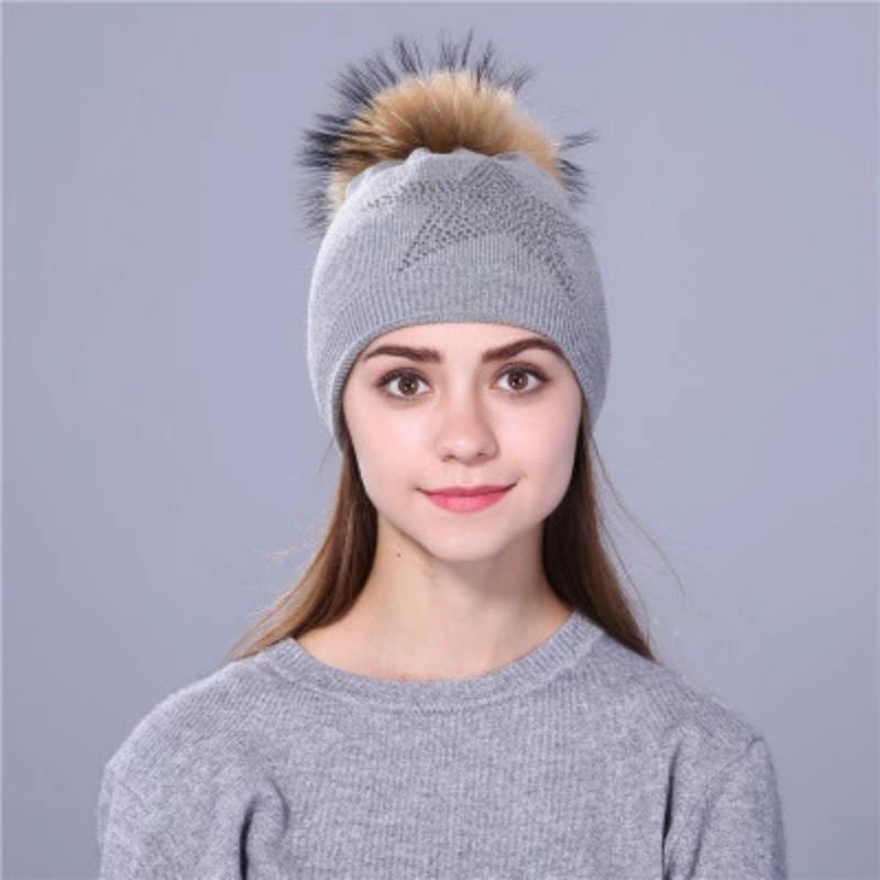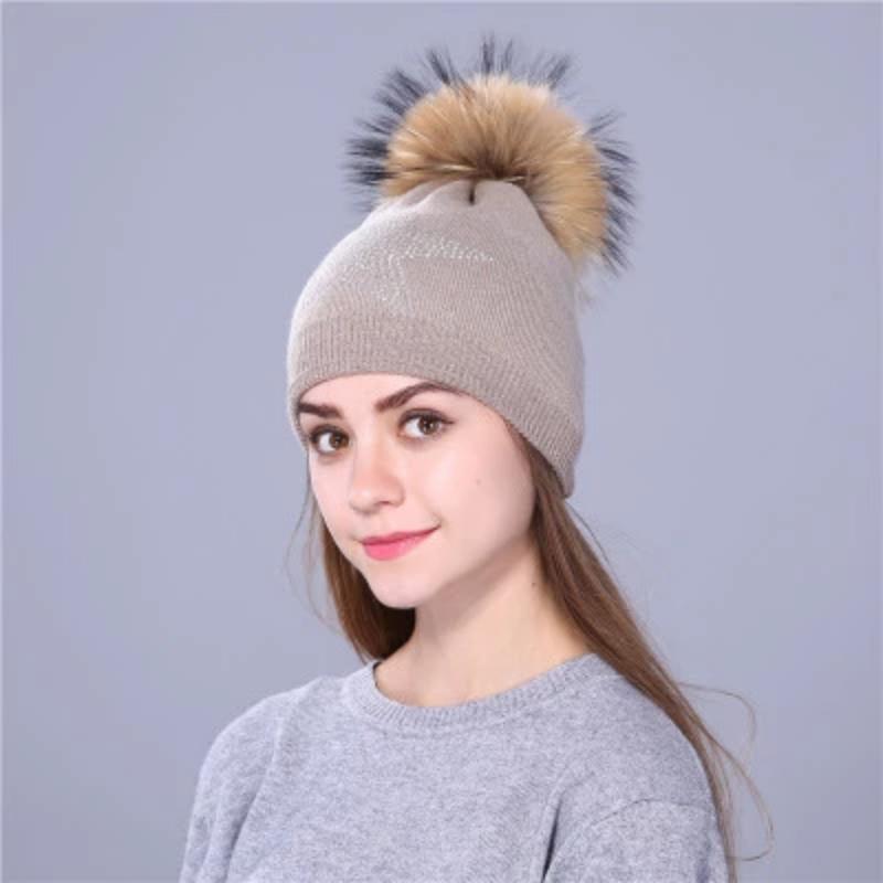 Women Wool Fox Fur Poms Warm Knitted Casual Hat