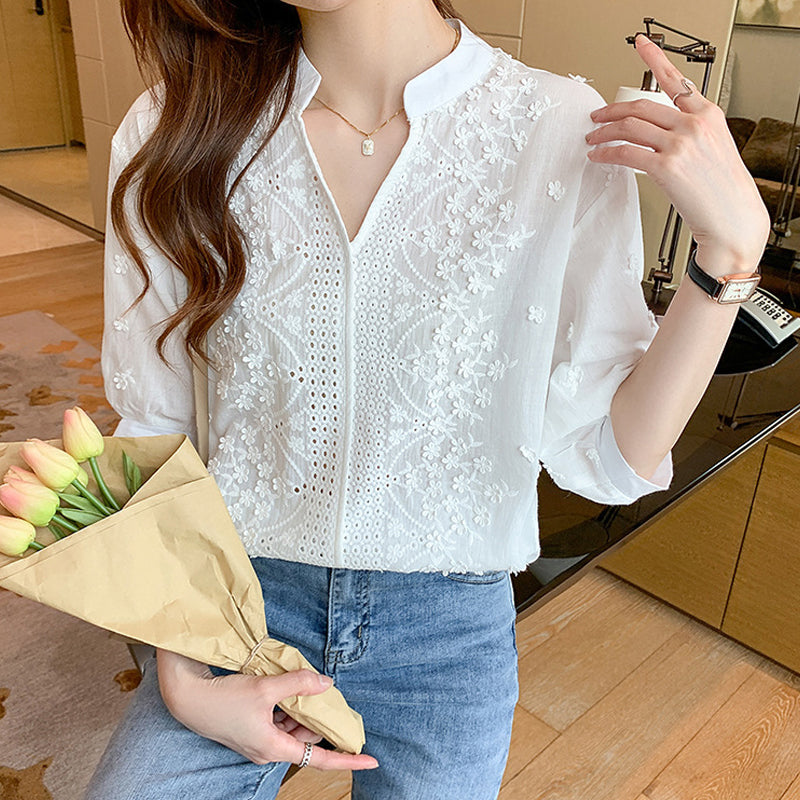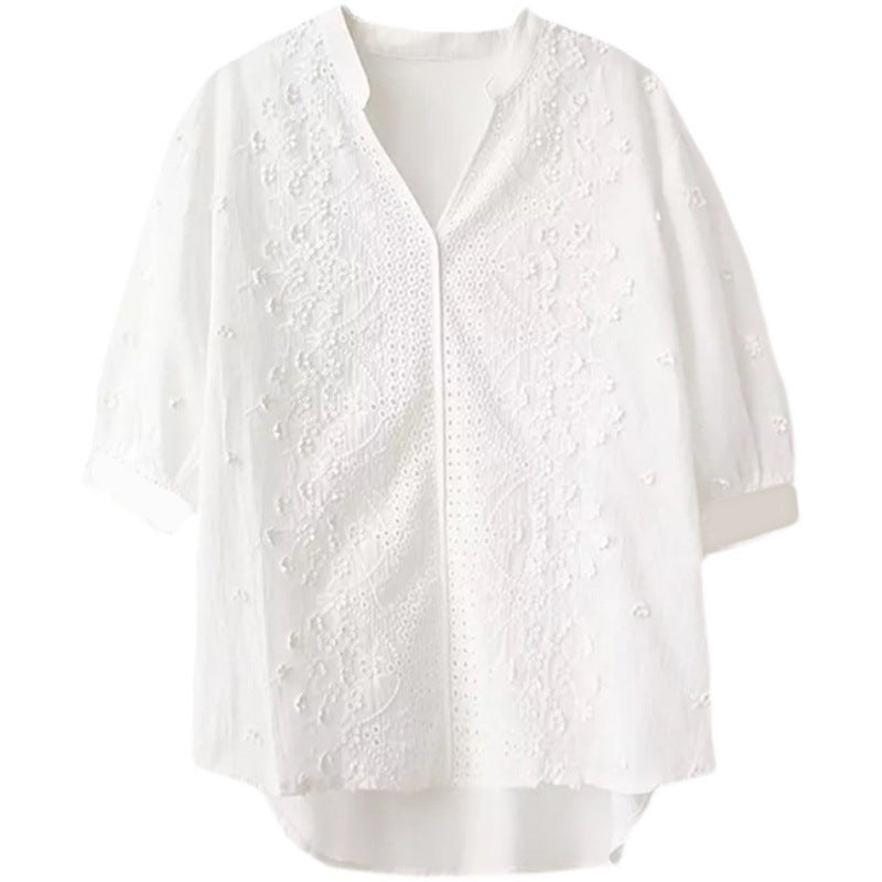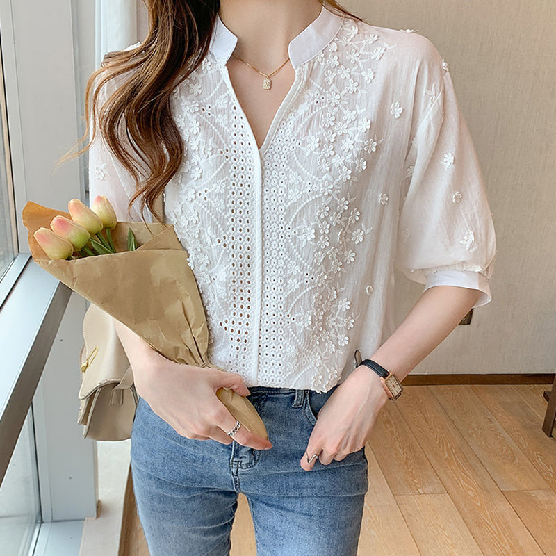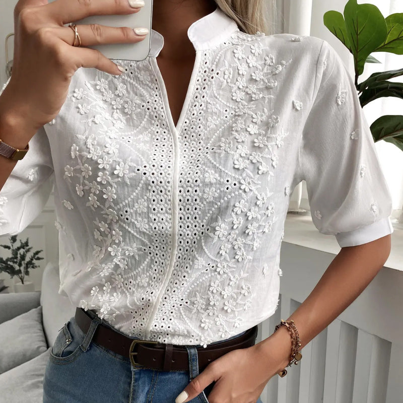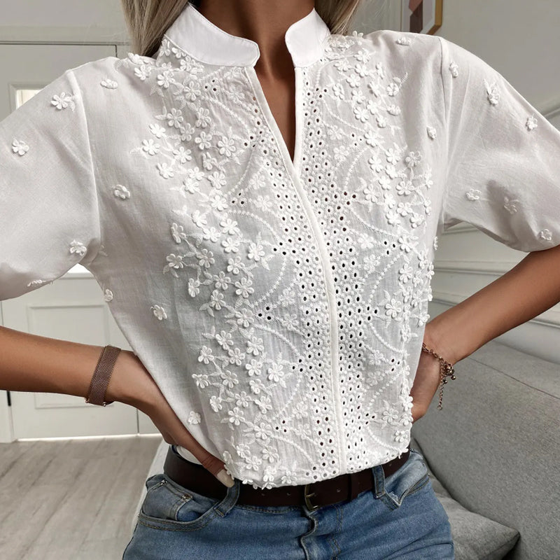 Floral Pattern Eyelet Embroidery Half Sleeve Top