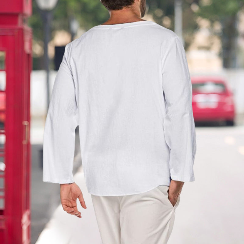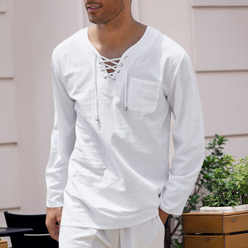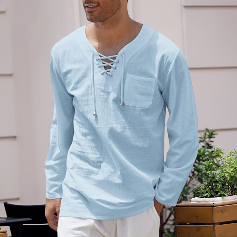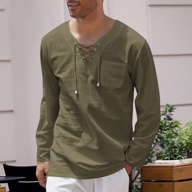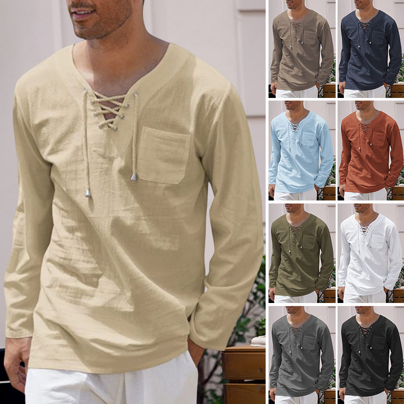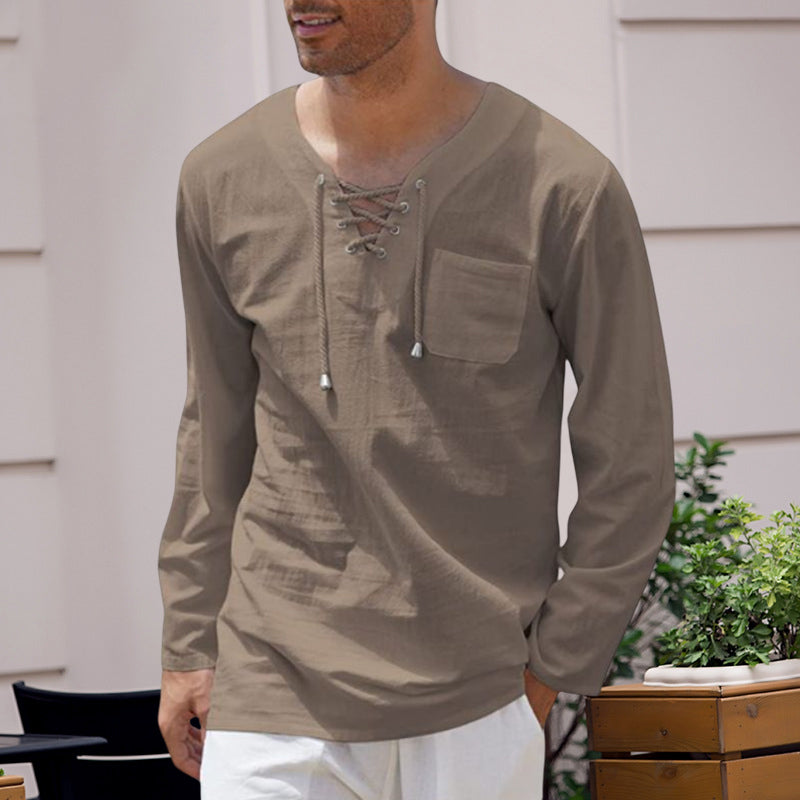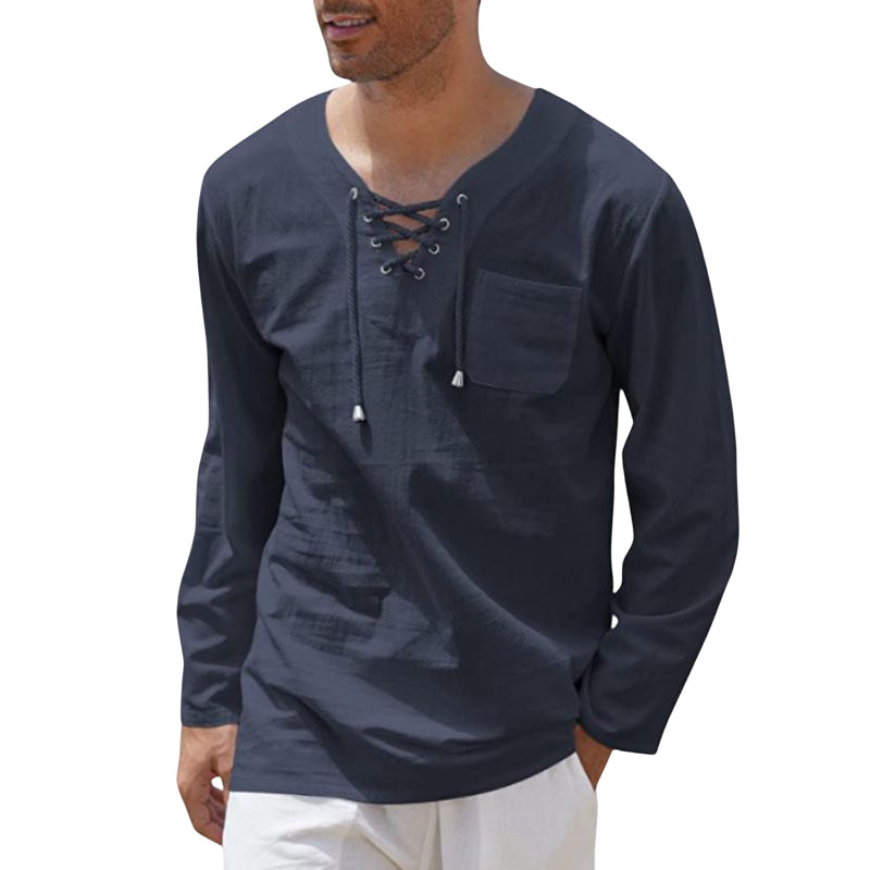 Men's Cotton Linen Casual Lace-Up V-Neck Long Sleeve T-Shirt
