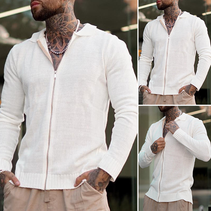Men's White Long Sleeve Casual Fashion Zip Knit Sweater