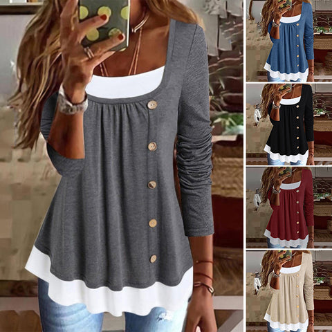 Round Neck Long Sleeve Color Block Button T-Shirt