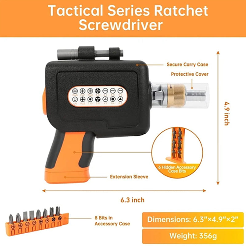 • Convenient Design: The screwdriver boasts an ergonomic pistol grip for comfort and ease of use, a pop-out magazine for quick bit changes, and a hidden bit storage for organizing all 14 bits.